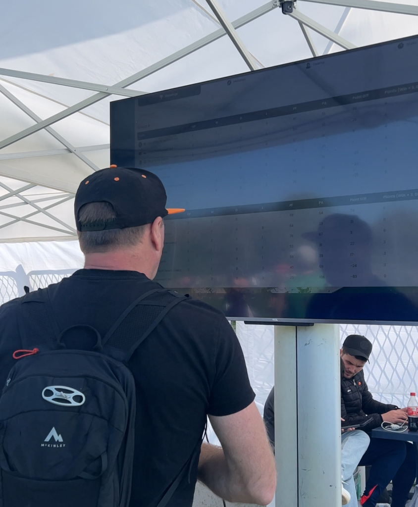 Además, contábamos con una pantalla en la propia carpa para que jugadores, coaches y fans pudieran acercarse y consultar en tiempo real las clasificaciones, marcadores y evolución del torneo. Esto convirtió el espacio en un punto de encuentro constante, donde la información estaba siempre accesible y visible para todos.