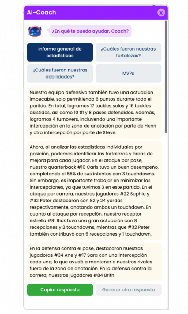 ¡Bienvenido al futuro del entrenamiento deportivo! En el corazón de nuestra plataforma se encuentra nuestro innovador AI Coach, una herramienta potenciada por Inteligencia Artificial diseñada para ayudar a los clubs a conseguir mejores resultados con sus estrategias de juego.