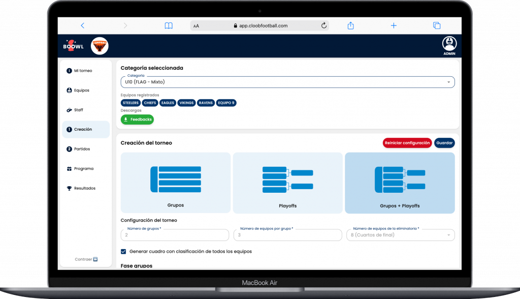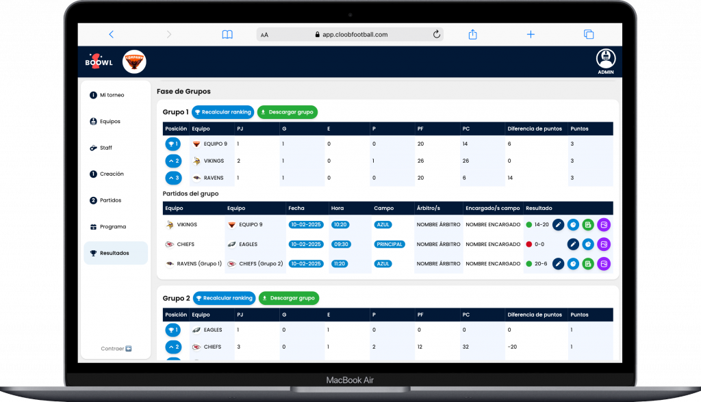 Gestiona inscripciones, grupos, calendarios, campos y árbitros con total flexibilidad.