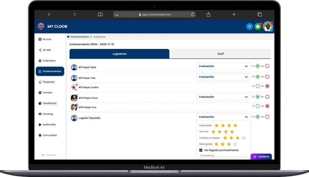 Keep a record of everything you do. Goal-based training, automatic attendance lists, organized drills, physical tests, routines, and individual tracking for each of your players.