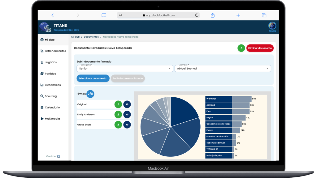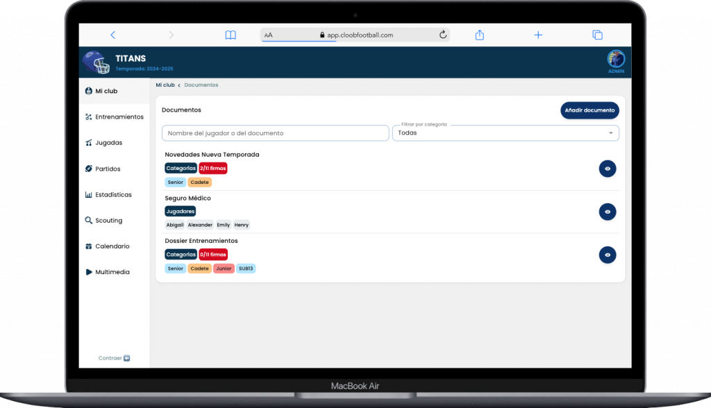 Puedes compartir documentos por categorías o por miembros y enviar documentación individual a los jugadores. También puedes solicitar la firma del documento y su cumplimentación.