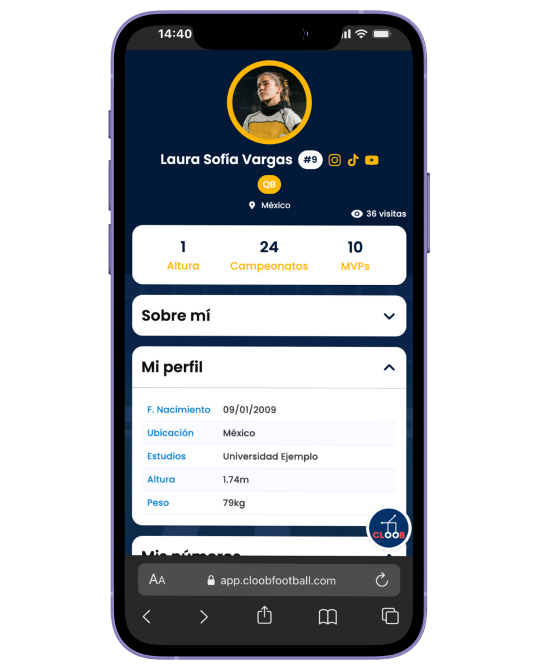 Crea tu perfil de jugador en Cloob Football y reúne tus métricas, logros, videos y trayectoria en una sola página profesional — lista para compartir con reclutadores, equipos y ligas.