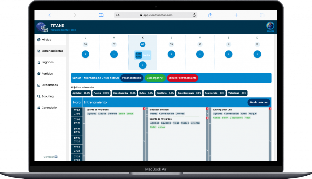 Prueba ya el sistema de gestión de entrenamiento diseñado específicamente para equipos profesionales de football americano.