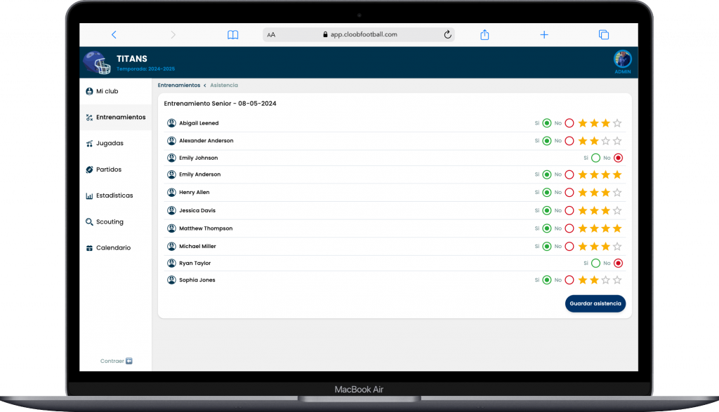 Los coaches del club tendrán acceso a los porcentajes de ejercicios entrenados y podrán evaluar el rendimiento y compromiso de cada jugador después de cada entrenamiento.
