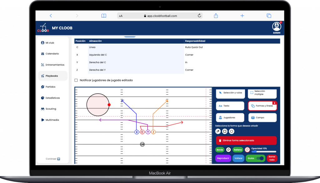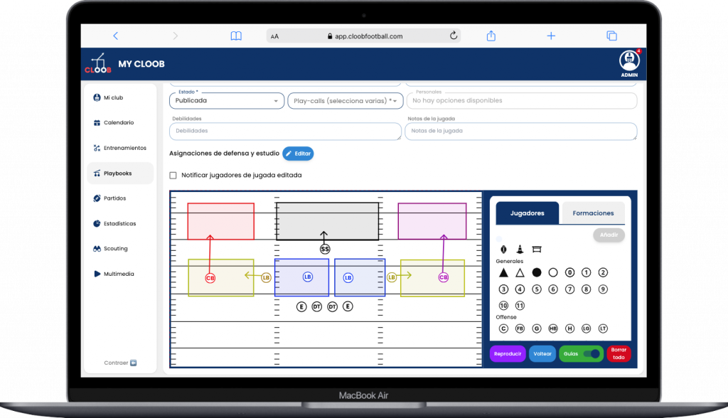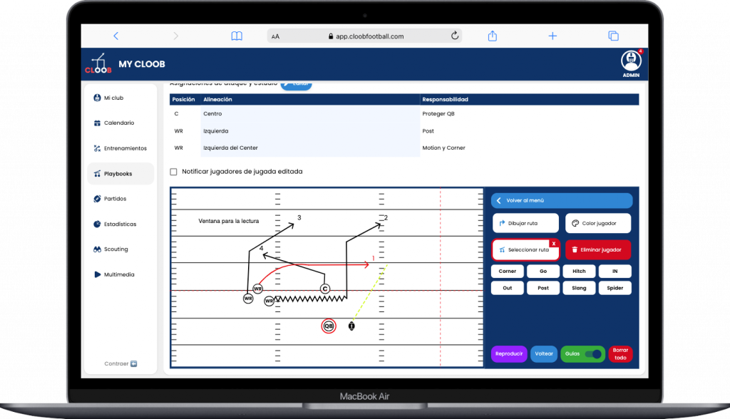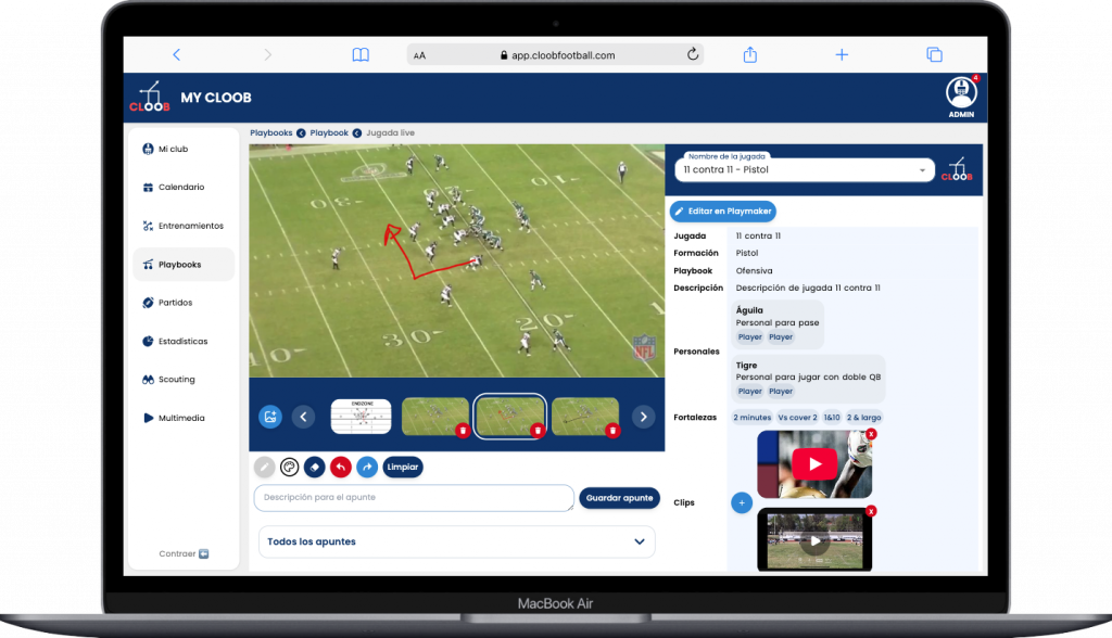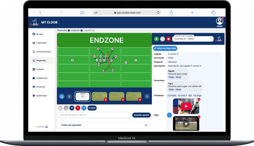 Playmaker Online de Cloob no solo te permite diseñar jugadas, sino analizarlas con videos, fotos, tablas de responsabilidades y lectura del QB, todo en una plataforma intuitiva.