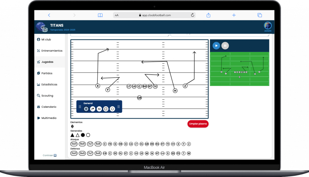 Con nuestra plataforma de creación de jugadas, tendrás las herramientas necesarias para diseñar y visualizar las jugadas, formaciones y rutas de una manera totalmente interactiva y sencilla.