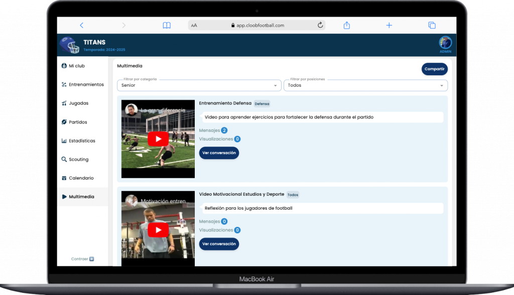 Los recursos de multimedia permiten subir y compartir contenido, incluyendo videos de referencia, ejercicios, jugadas de partidos para análisis, y más. Además, los jugadores podrán comentar y compartir entre ellos a través del chat habilitado.